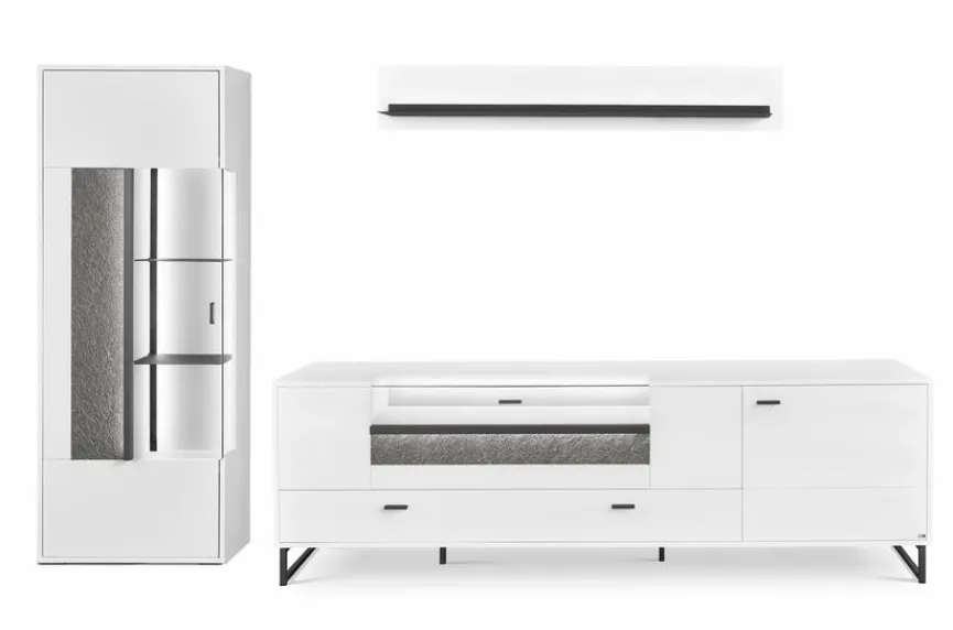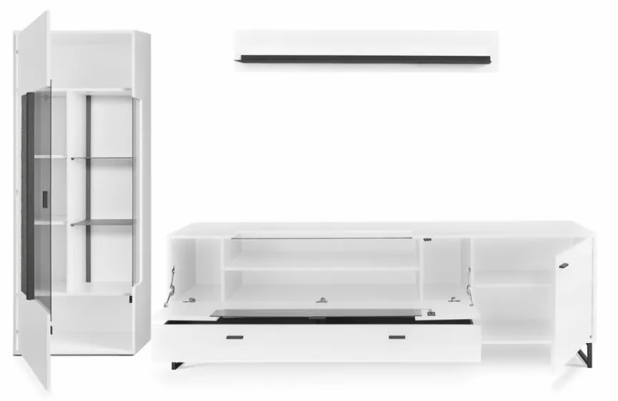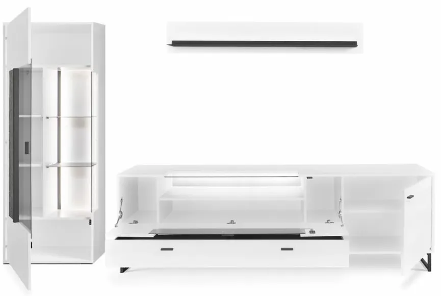 - Bestehend aus Vitrine, TV-Lowboard und Wandboard