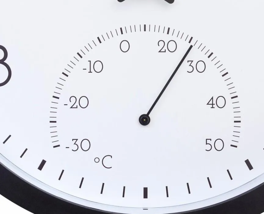Mit der Quarzwanduhr Marigold Ø30,5cm des Herstellers Nextime werden Sie nicht nur über die exakte Uhrzeit informiert, sondern auch über die aktuelle Temperatur. Dabei sind die Zifferblätter und die Zeiger auch aus größerer Entfernung leicht zu erkennen. Übrigens können Sie die Quarzwanduhr Marigold Ø30,5cm wegen des Spritzwasserschutzes auch bedenkenlos im Außenbereich nutzen.