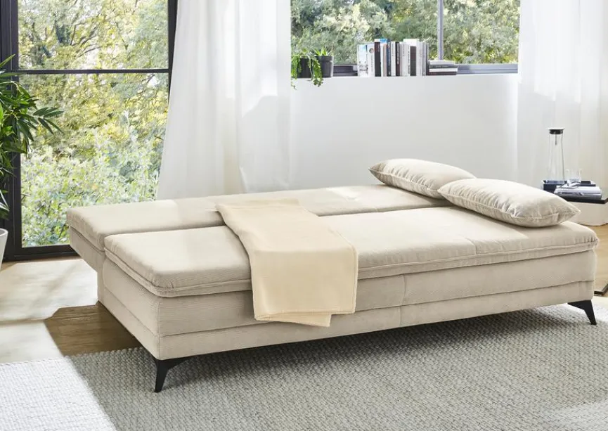 - Inkl. Schlaffunktion durch umklappbaren Rücken und Bettkasten