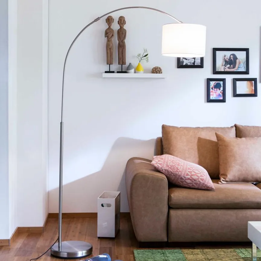 Eine moderne Stehlampe für Design-Liebhaber: Besonders schön ist die harmonische Kombination aus wohlgeformtem Bogen und hübschem Lampenschirm aus Stoff. Die Leuchte ist höhenverstellbar und kann so individuell angepasst werden.