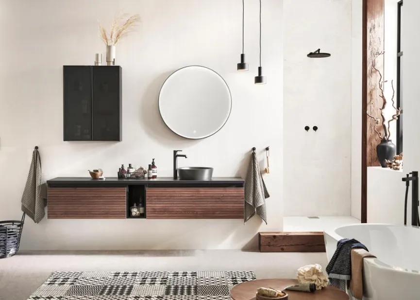 - Inkl. Keramik-Aufsatzwaschtisch rund in Schwarz mit Permanentablauf (nur mit nicht verschließbaren Ablaufventilen kombinierbar)