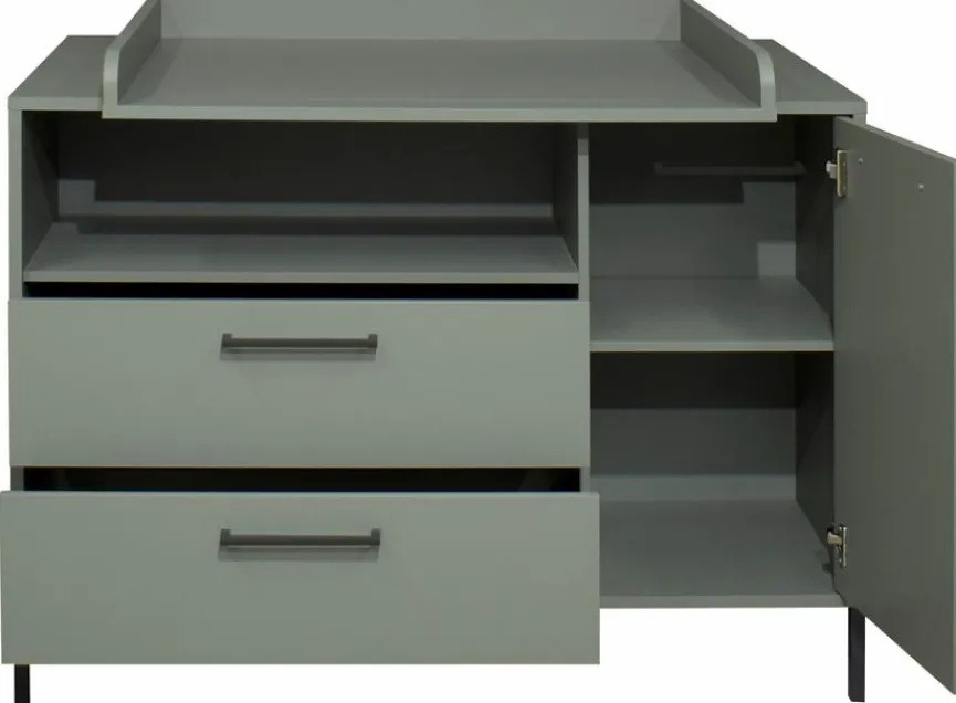 - Aus Holzwerkstoff (Spanplatte) mit kratzfester Melaminharzfolie in Pine Green Matt Lack, Füße und Griffe aus Metall