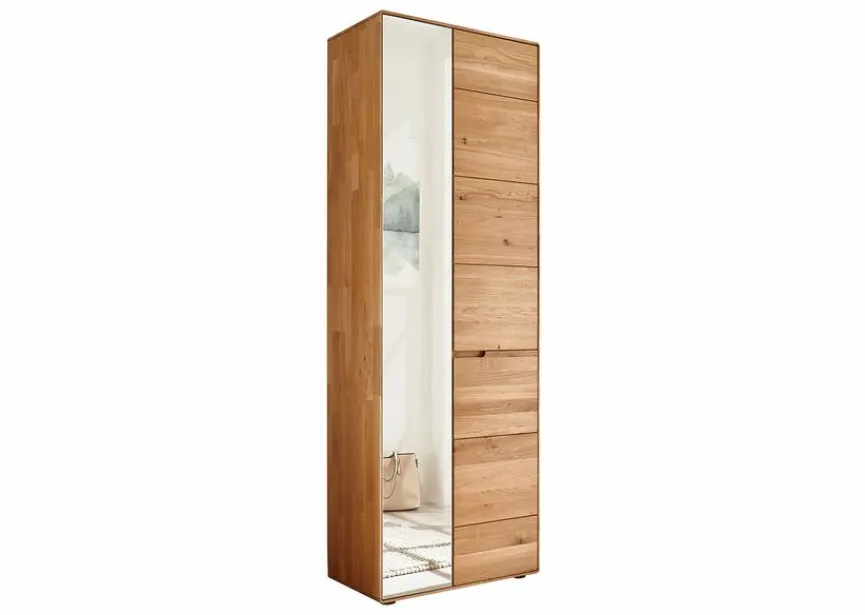 Der schicke Garderobenschrank Stockholm von G+K strahlt aufgrund des verwendeten Materials Wärme und Natürlichkeit aus. Praktischerweise ist der hochwertige Dielenschrank unter anderem mit einer Spiegeltür ausgestattet. Im Inneren bietet der Garderobenschrank Stockholm mit zwei Konstruktionsböden und einer ausziehbaren Kleiderstange Platz für Jacken, Mäntel und Accessoires.