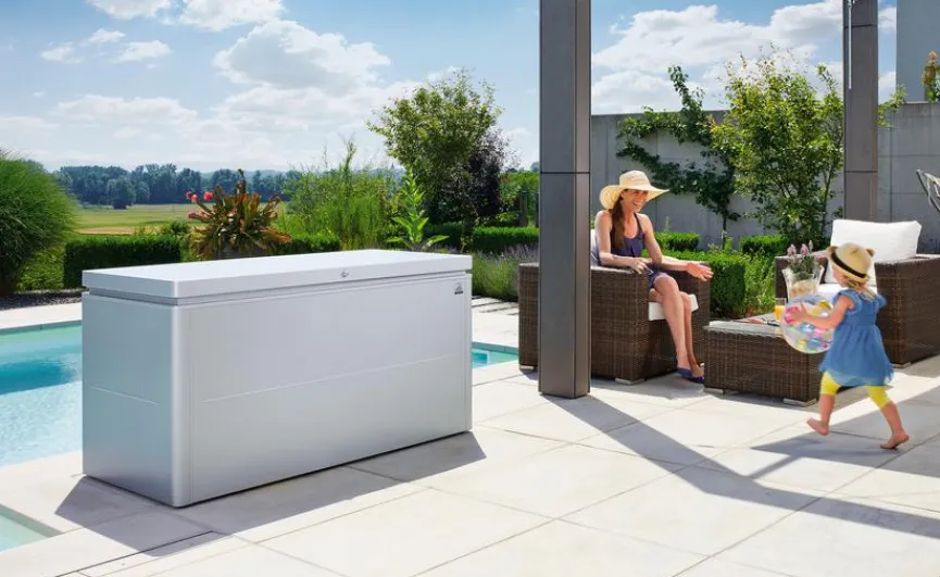 Diese regenwasserdichte Loungebox 160×70 cm hat einen stabilen, witterungsbeständigen Deckel und innen eine nicht sichtbare, integrierte Durchlüftung. Um beste Stabilität und Qualität sowie Langlebigkeit zu gewährleisten, wird die Freizeit-Box aus einem feuerverzinkten, einbrennlackiertem Stahlblech gefertigt. Scharniere und Schrauben der Loungebox 160×70 cm sind aus Edelstahl.
