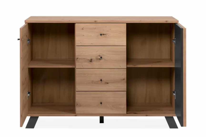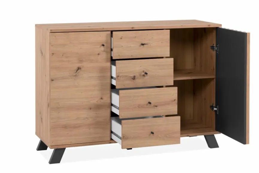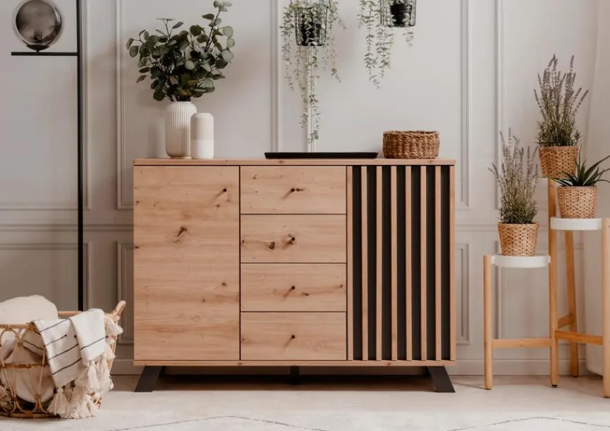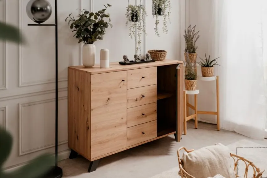 Die attraktive Kommode Medan begeistert Einrichtungsfans mit ihrem ausdrucksstarken Design, das durch die angesagte Holz-Optik am Puls der Zeit liegt. Sie lässt sich nicht nur mit vielen Einrichtungsstilen kombinieren, sondern bietet Ihnen im Wohnzimmer, im Schlafzimmer oder in der Diele einen stylischen Stauraum für Ihre Utensilien. So sorgen Sie mit der Kommode Medan gleichzeitig für Ordnung und modernes Flair.