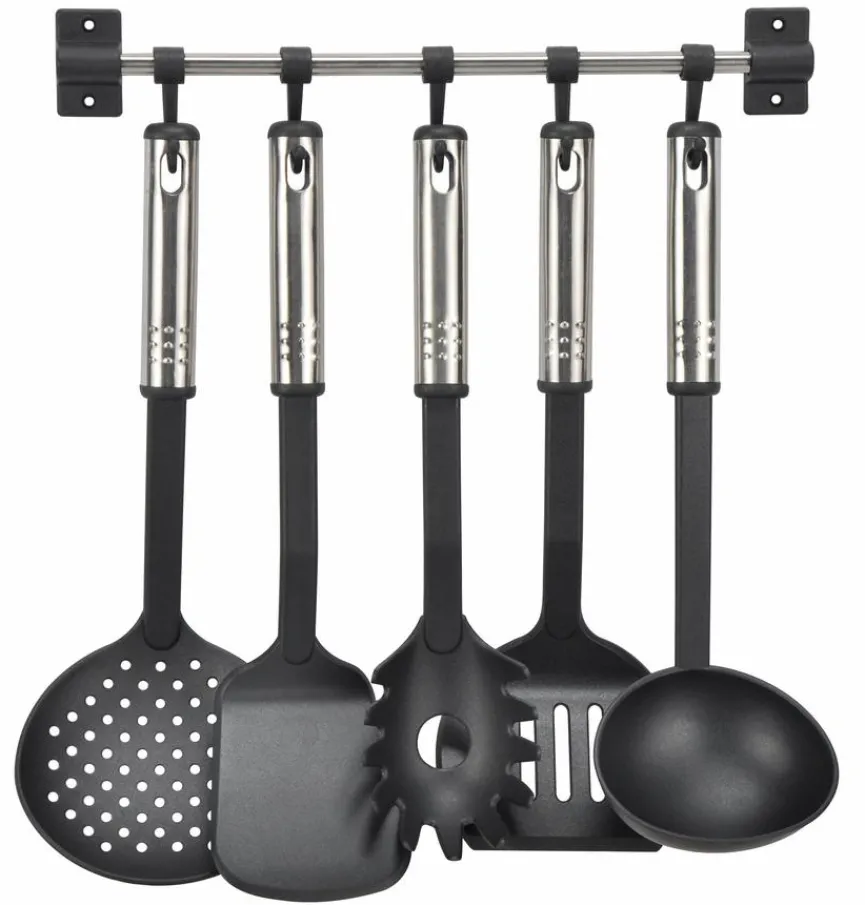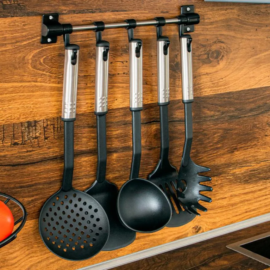 Mit dem Küchenhelfer-Set 6tlg. erhalten Sie einen ebenso praktisches wie auch stylisches Ordnungssystem, das Sie direkt an der Wand über der Arbeitsfläche anbringen können. So haben Sie Schaumlöffel, Pfannenwender, Spaghettilöffel und Suppenkelle stets griffbereit. Da lediglich der Griff der einzelnen Teile sowie die Leiste aus Metall bestehen, eignet sich das Küchenhelfer-Set 6tlg. auch für beschichtete Pfannen und Töpfe.
