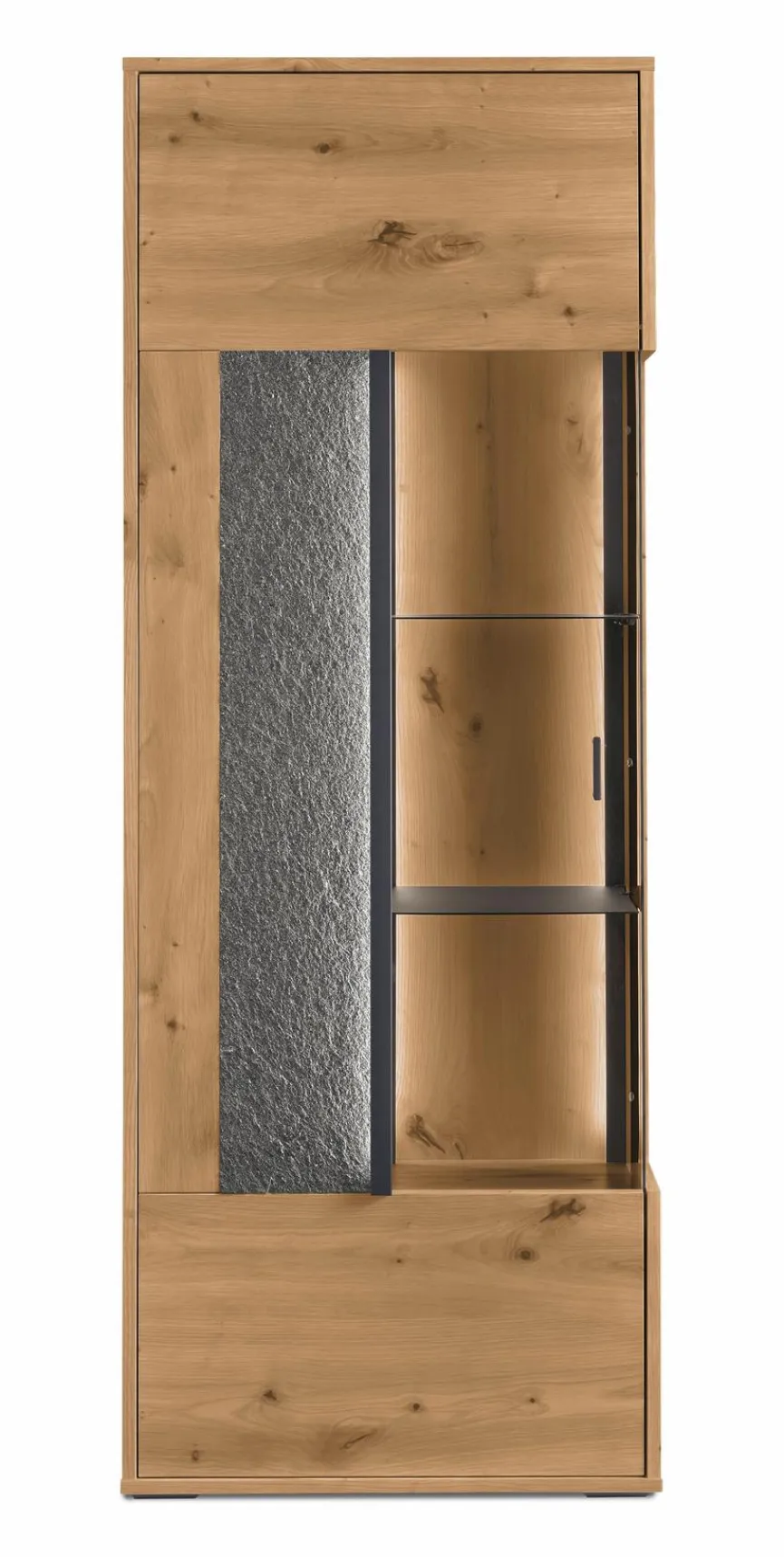 - Korpus und Front aus Holzwerkstoff (Spanplatte) mit kratzfester Melaminharzfolie in Eiche Artisan, Absetzung aus Steinfurnier in Black Pearl-Sandstone