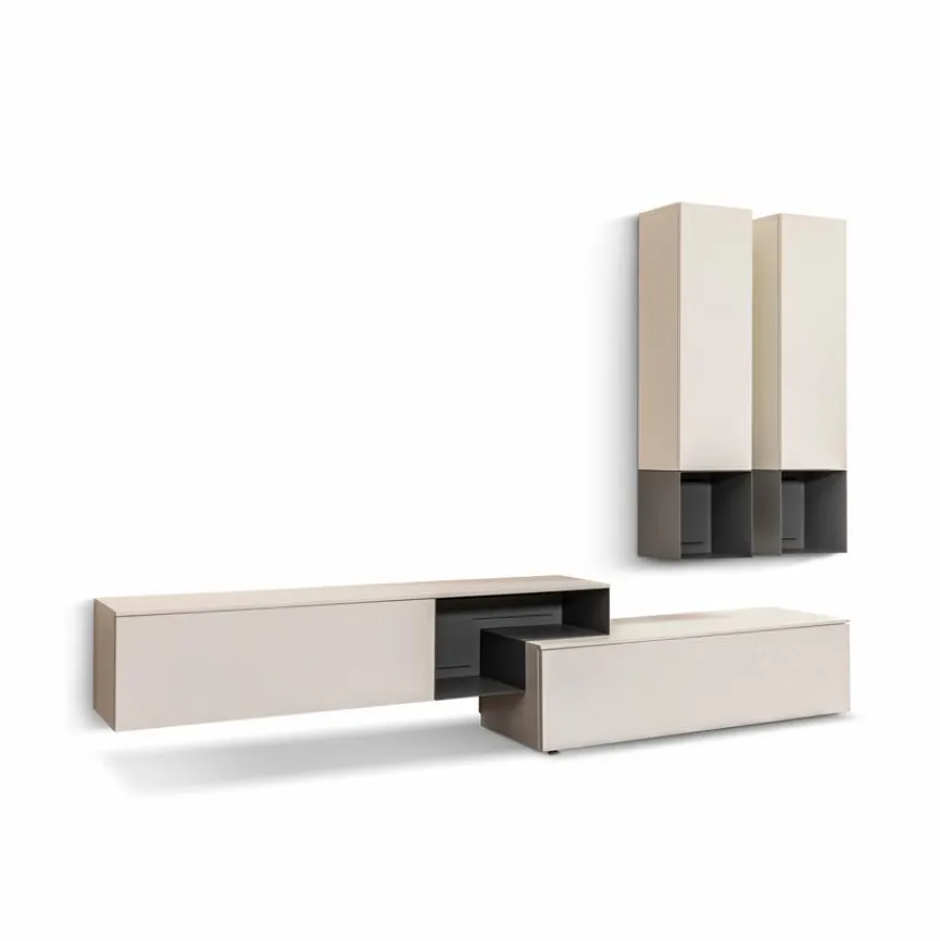 - Wohnwand bestehend aus: 1 Lowboard, 1 Hängelowboard, 2 Hängevitrinen