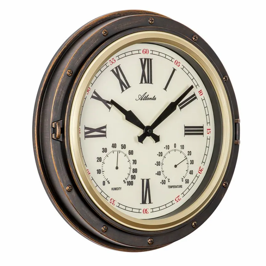 Für die Quarzwanduhr 4546 Ø40cm hat sich Paragon (Atlanta) ein ganz besonderes Design einfallen lassen. Dieser Zeitmesser erinnert in Form und Design an ein Bullauge. Darüber hinaus kommen auch bei den originellen Skalen Assoziationen zu Schiffsinstrumenten auf. Denken Sie bei jedem Blick auf die Quarzwanduhr 4546 Ø40cm an die Weite der Ozeane.