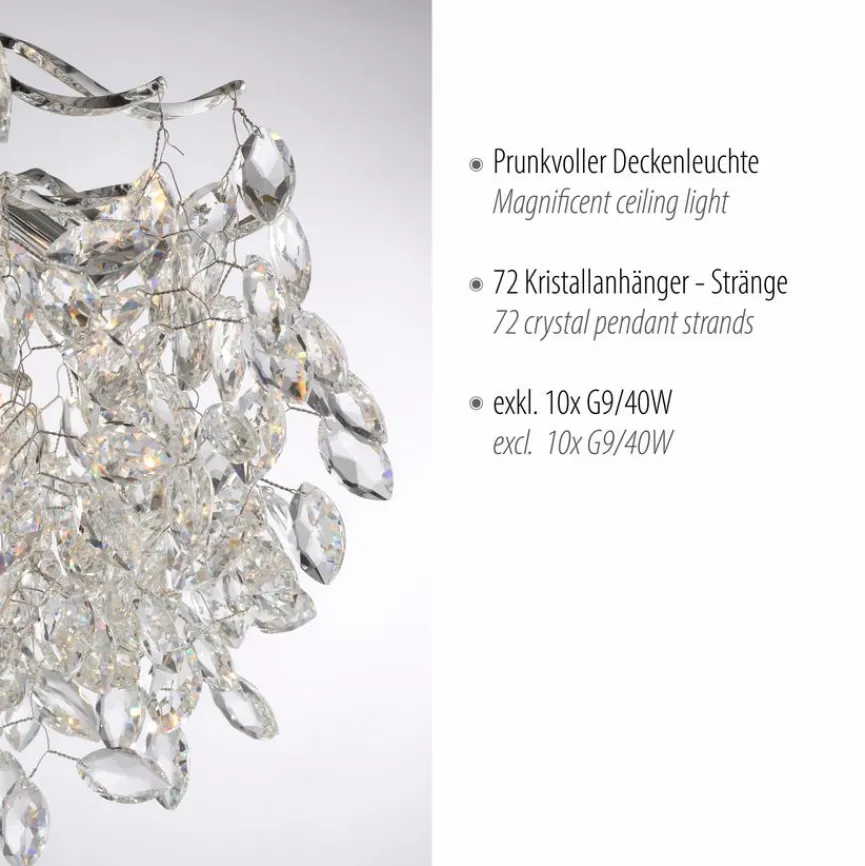 Die elegante Deckenleuchte Ricicle von Paul Neuhaus begeistert mit ihrem glänzenden Chrom-Finish und funkelnden Kristallanhängern, die jedem Raum das gewisse Extra verleihen. Mit bis zu 10 G9 Glühbirnen bis maximal 40 W ausgestattet, sorgt die Deckenlampe für eine gleichmäßige, helle Beleuchtung und schafft ein einladendes Ambiente. Ob im Wohnzimmer, Esszimmer oder Flur – die Deckenleuchte Ricicle setzt stilvolle Akzente.