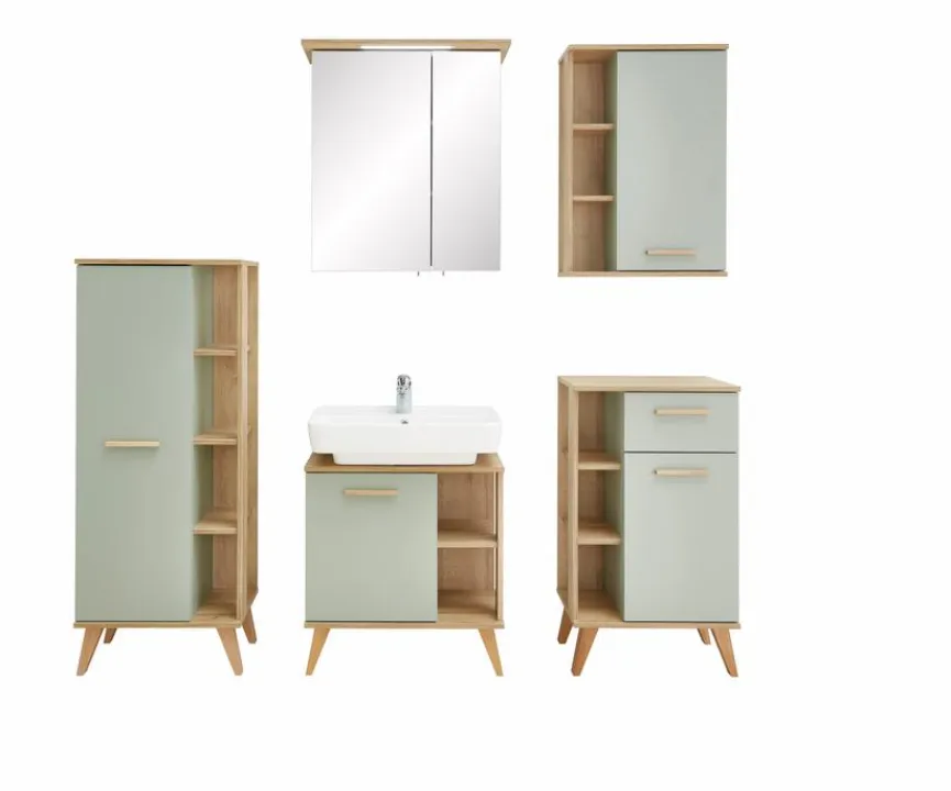 - Bestehend aus Waschbeckenunterschrank mit 1 Tür und seitliche Ablagefächer, Spiegelschrank mit 2 Türen und LED-Beleuchtung