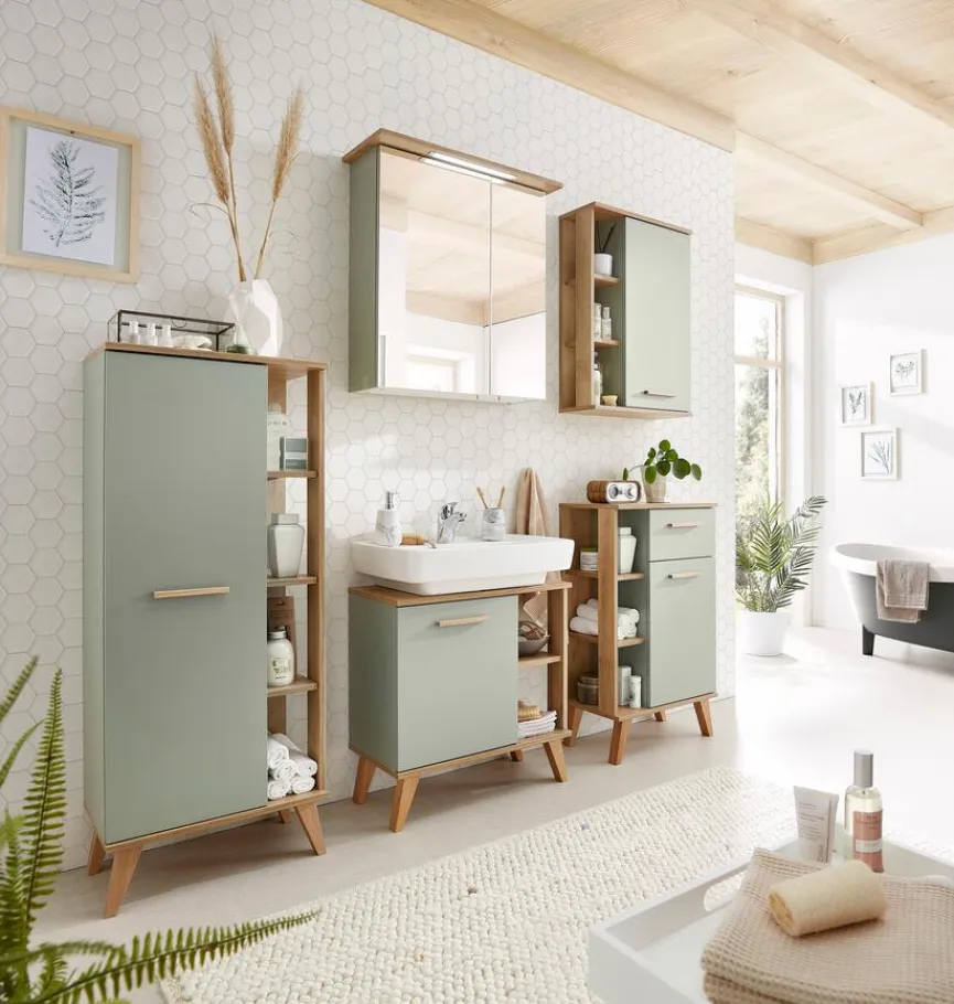- Front aus Spanplatte mit Melaminharzfolie in Salbei, Korpus aus Spanplatte mit Melaminharzfolie in Salbei/Riviera Eiche quer Nachbildung