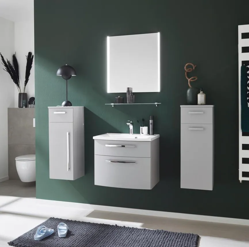 Flächenspiegel: B/H/T ca. 60x64x4,3 cm, Waschtischunterschrank: B/H/T ca. 60x48x46,9 cm, Waschtisch: B/H/T ca. 60,6×2,8×48,6 cm