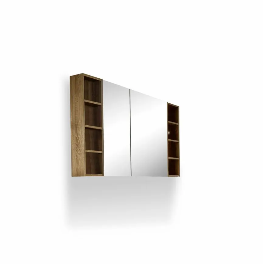 Der Spiegelschrank Kera Plan der Marke Puris überzeugt mit einem modernen Design und natürlichen Akzenten. Es besteht aus zwei großen und praktischen Spiegeln, welche als Türen angebracht sind. An den Außenseiten befinden sich offene, aus Holz gefertigte Fächer. Dadurch sorgen Sie durch den Spiegelschrank Kera Plan von Puris für natürliche und frische Akzente in Ihrem Badezimmer.