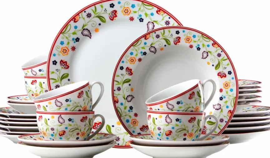 - Je 6 Speiseteller Ø 27 cm, Suppenteller Ø 21,5 cm, Frühstücksteller Ø 20,5 cm, Kaffeetassen 220 ml, Untertassen Ø 16 cm