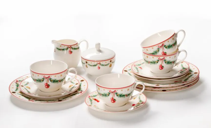 - Je 4 Dessertteller Ø 20,5 cm, Kaffeetassen 250 ml, Untertassen Ø 15,5 cm und je 1 Milchkännchen, Zuckerdose