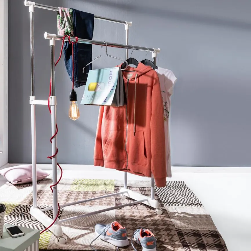 Nicht selten ist es der Fall, dass Kleidungsstücke, die häufig benötigt werden, ein ziemliches Chaos im Raum hinterlassen. Diese Rollgarderobe Hanger Trolley stellt eine erstklassige Wahl dar, wenn für Ordnung gesorgt werden soll. Bei der Rollgarderobe Hanger Trolley bestimmen zudem modern-sachliche Designelemente den Look.