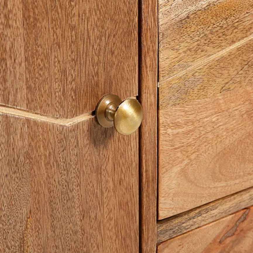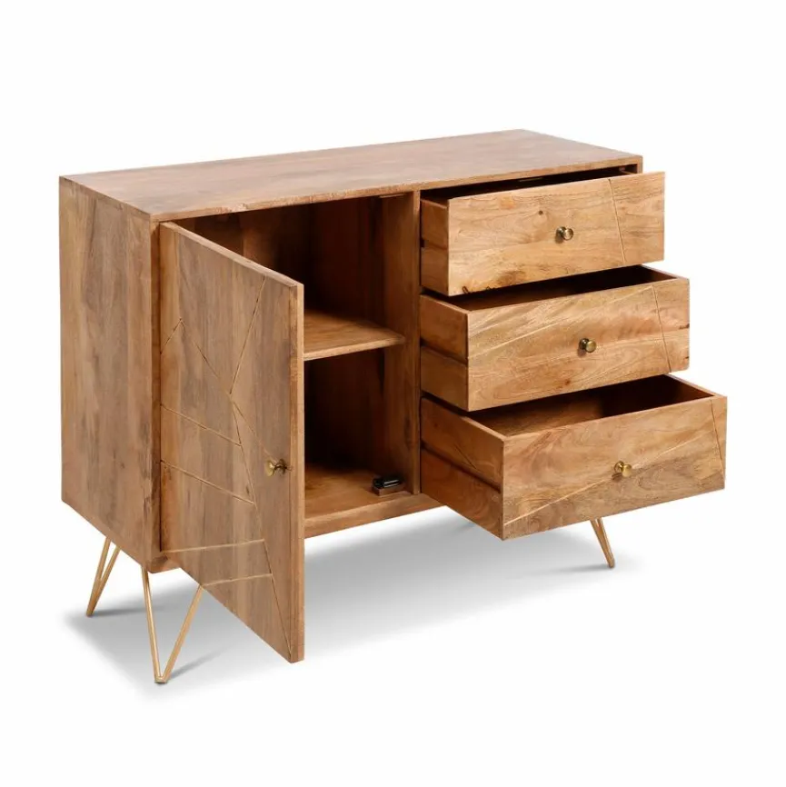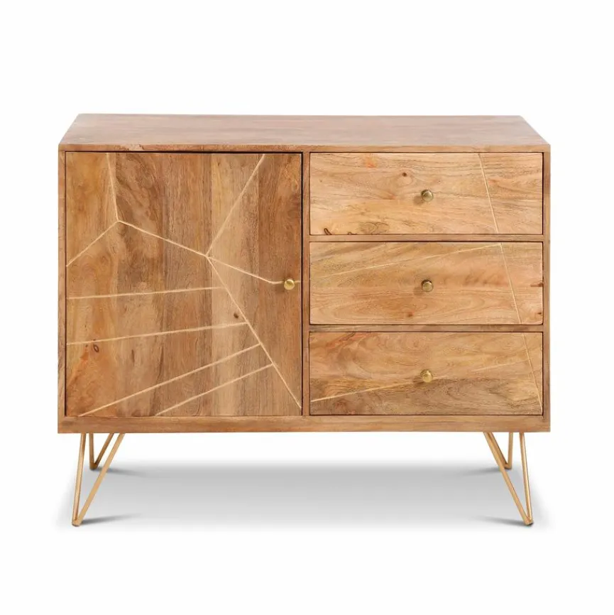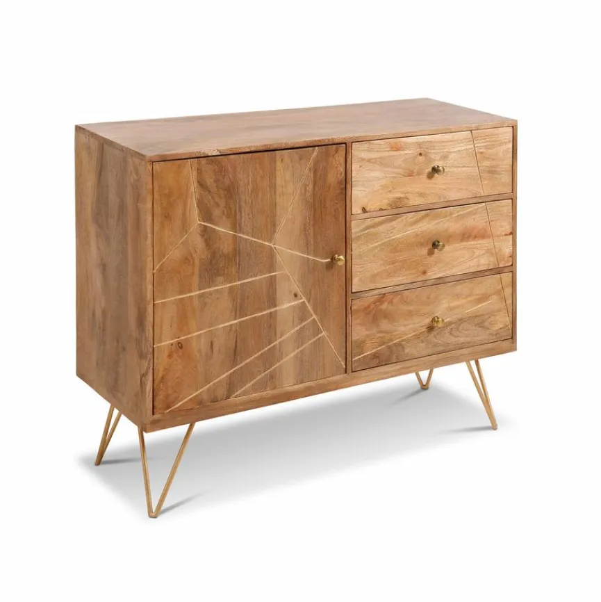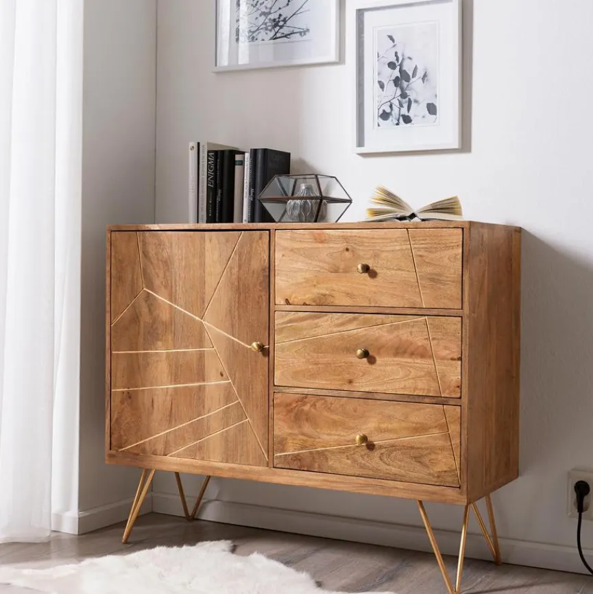 Filigran designte Metallfüße und linienförmige Einfräsungen, die ein abstraktes Muster ergeben, machen die extravagante Optik der Kommode Scan aus. Aber auch das gebeizte und lackierte Mangoholz trägt zum extravaganten Charme des Eyecatchers bei. Die Kommode Scan wartet mit einer Tür und Schubladen auf.