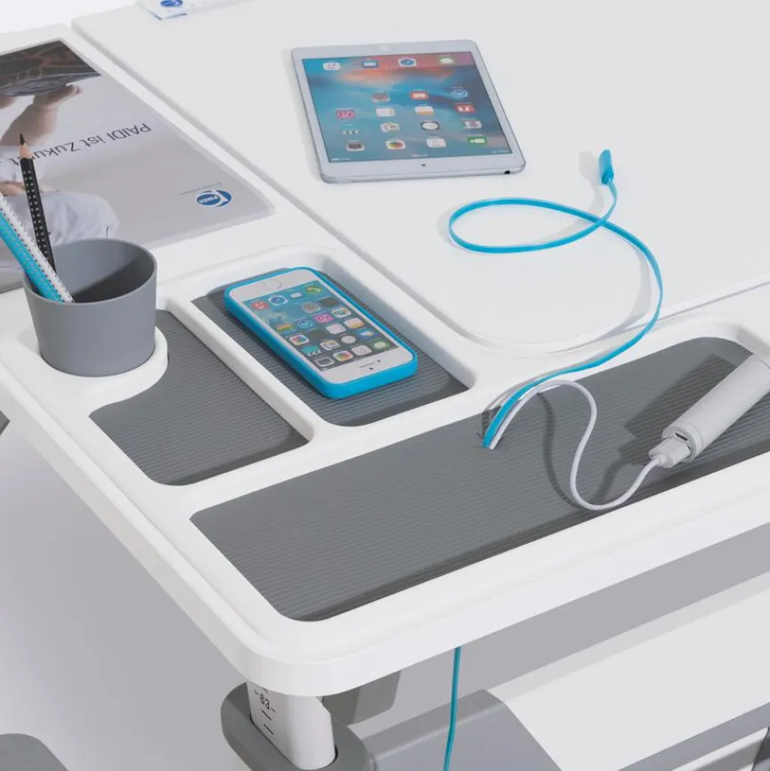 - Tischplatte geteilt, inkl. Stiftebecher und dreiteiliger Utensilienschale