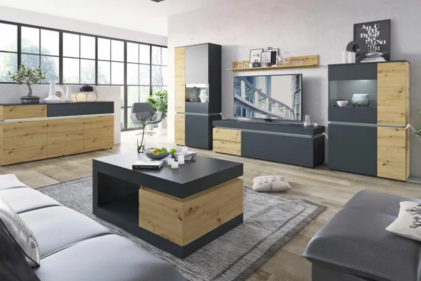 - Aus Holzwerkstoff (Spanplatte) mit kratzfester Melaminharzfolie in Kosmos Grau, Absetzung aus Holzwerkstoff (Spanplatte) mit kratzfester Melaminharzfolie in Eiche Artisan