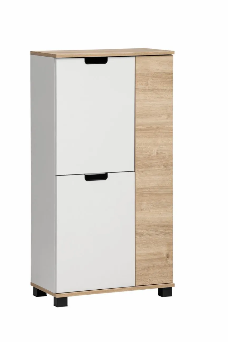 - Front und Korpus aus Holzwerkstoff (Spanplatte) mit kratzfester Melaminharzfolie in Weiß mit Akzent in Eiche hell
