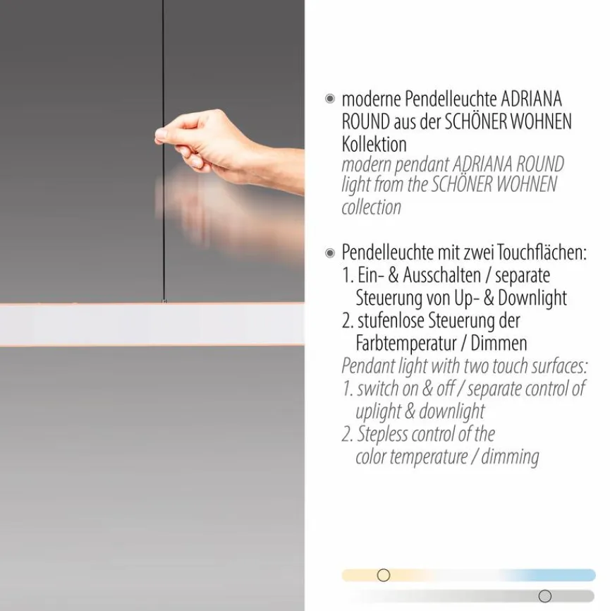 Für eine behagliche Atmosphäre in Ihren vier Wänden sorgt die LED-Pendelleuchte Adriana Round aus der SCHÖNER WOHNEN-Kollektion. Die LED-Pendellampe überzeugt mit edlem Design, hochwertiger Qualität und schlichtem Look. Setzen Sie mit der modernen LED-Pendelleuchte Adriana Round einen tollen Akzent über dem Esstisch, der Kochinsel oder im Eingangsbereich.