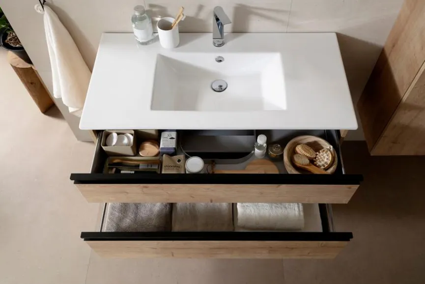 - Bestehend aus Waschtischunterschrank mit 2 Metallschubkästen mit Einzugsdämpfung, Keramik-Waschtisch in Weiß mit integriertem Überlauf