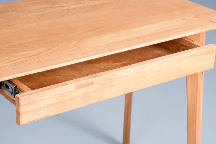 Der Schreibtisch Kevini vereint eine hohe Funktionalität und eine attraktive Optik. Markantes geöltes Massivholz und puristische Formen verleihen dem Möbel ein geschmackvolles Äußeres. Darüber hinaus überzeugt der Schreibtisch Kevini durch eine hohe Material- und Verarbeitungsqualität. Im Schubfach bietet er praktischen Platz für Schreibutensilien und andere kleine Gegenstände.