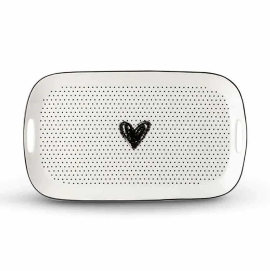 Ein attraktiv gestaltetes Punktmuster verleiht der Servierplatte Jessica 35,6×21 cm ein ansprechendes Design. Darüber hinaus definiert ein stilsicher arrangiertes Herzmotiv das romantisch verspielte Erscheinungsbild dieses Tabletts. Auf diese Weise ist die Servierplatte Jessica 35,6×21 cm ein optisches Highlight für Ihre heimische Wohneinrichtung.