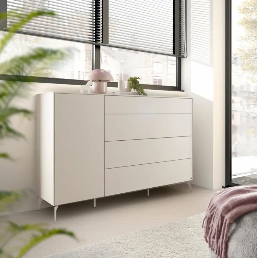 Dezente Eleganz und zeitlose Optik zeichnen die Kommode Riverside von set one by Musterring aus. Hinter einer Tür und in vier Schubladen findet sich reichlich Platz, um Geschirr, Tischwäsche, Accessoires oder andere liebgewonnene Dinge aufzubewahren. Dank der schlichten Farbgebung und der klaren Form passt die Kommode Riverside zu jedem modernen Einrichtungsstil.