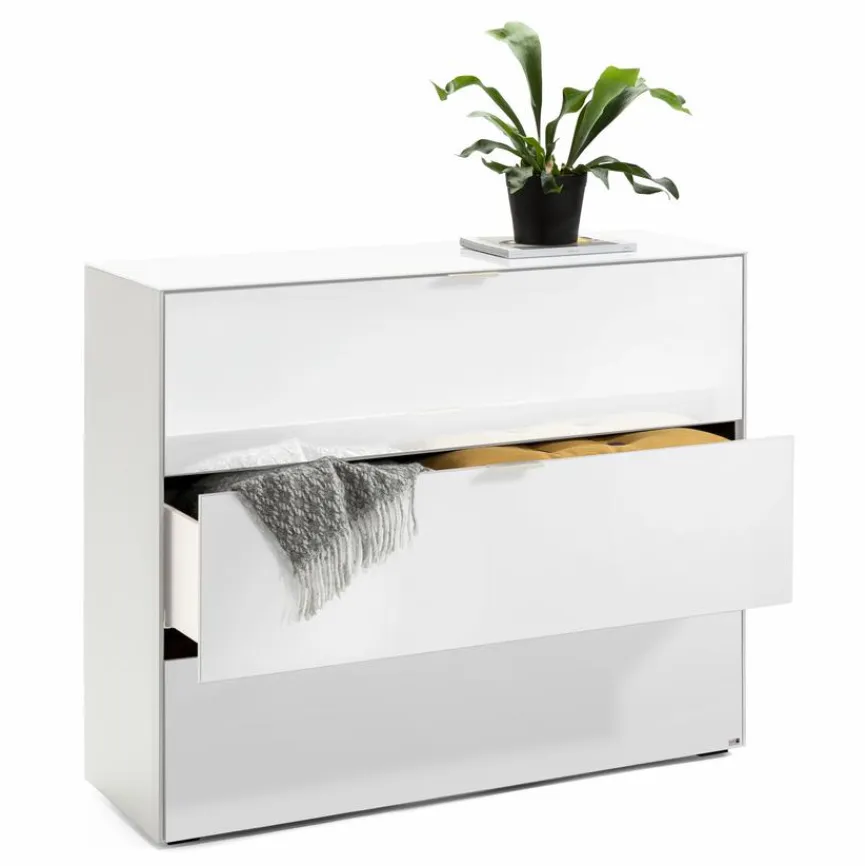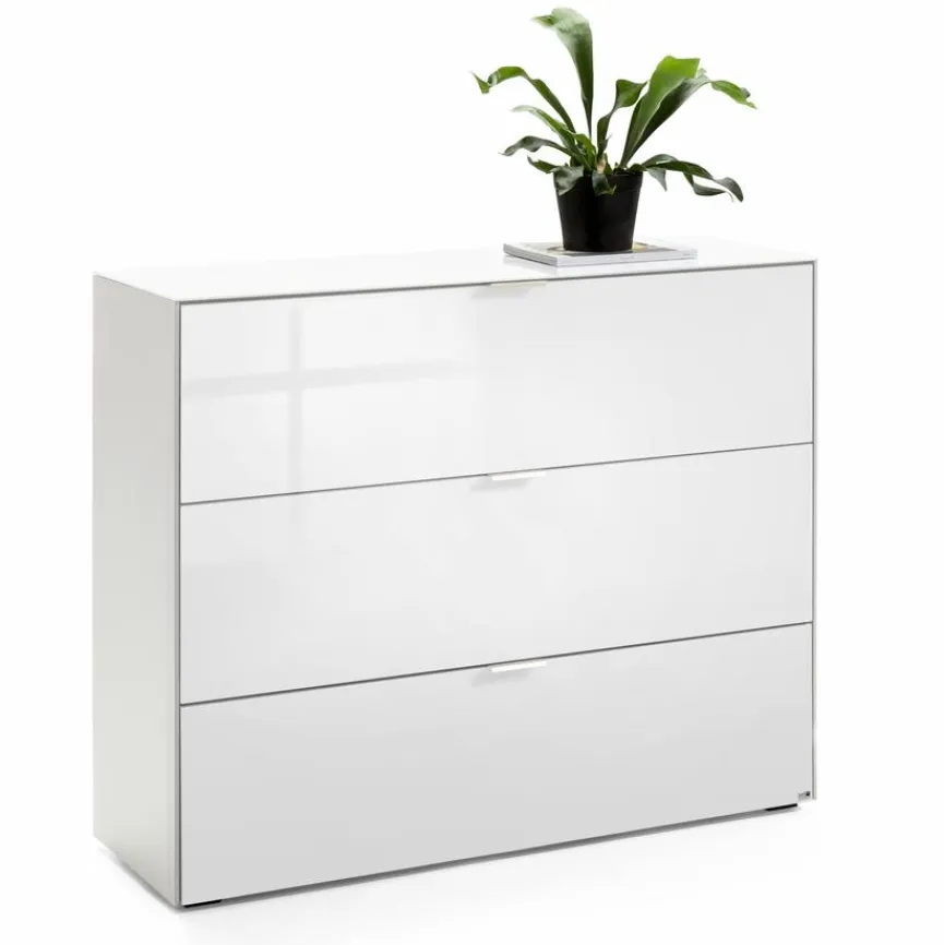 - Aus Holzwerkstoff (Spanplatte), Korpus mit kratzfester Melaminharzfolie in weiß matt, Front und Oberplatte aus Glas weiß glänzend lackiert