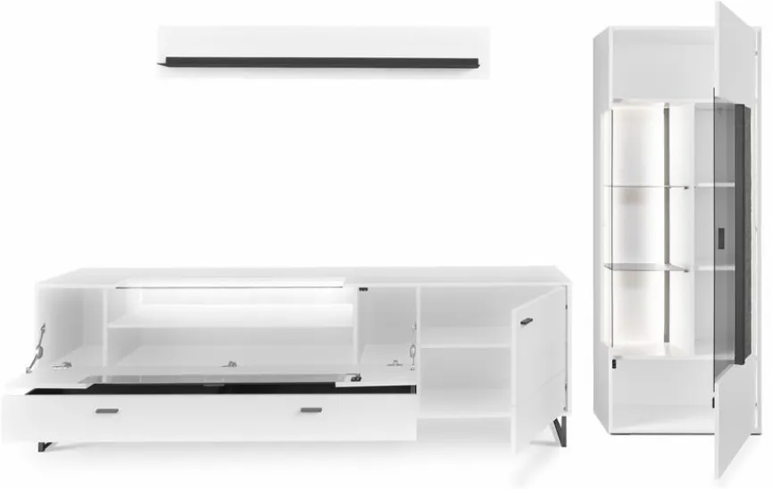 - Bestehend aus Vitrine, TV-Lowboard und Wandboard