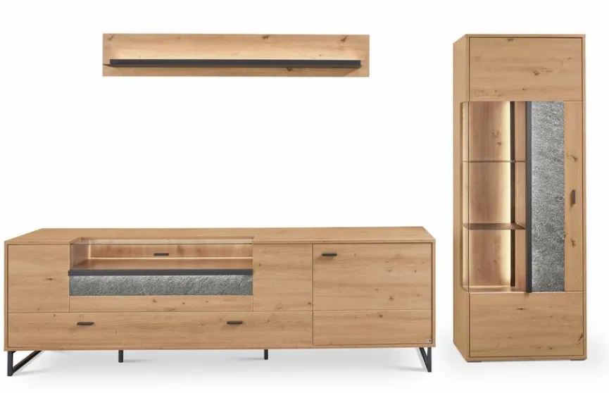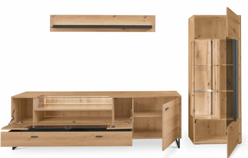 - Bestehend aus Vitrine, TV-Lowboard und Wandboard