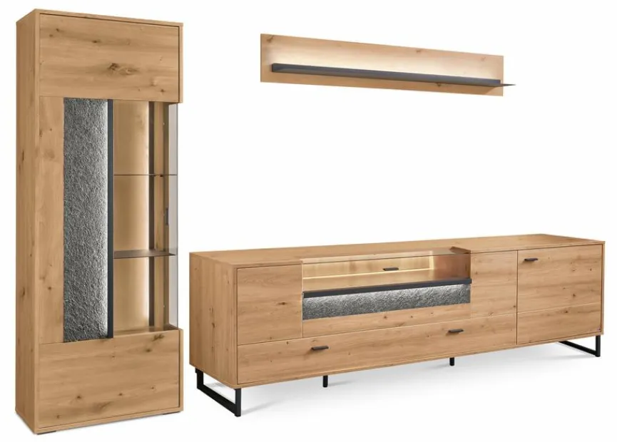 - Bestehend aus Vitrine, TV-Lowboard und Wandboard