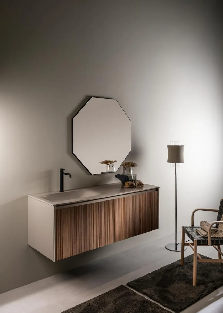 - Waschtischplatte in Mineral Geacril in Avana Opaco matt lackiert, ohne Überlauf, mit Permanentablauf, inkl. Hahnlochbohrung (nur mit nicht verschließbaren Ablaufventilen kombinierbar)