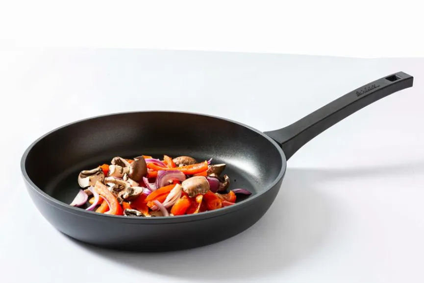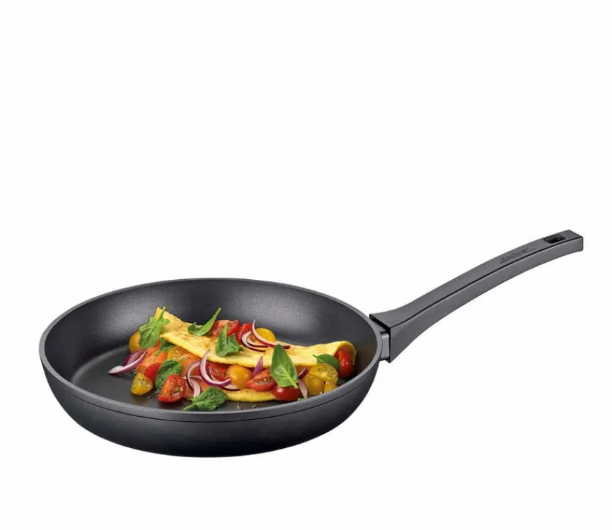 - Mit geschmiedetem Pfannenkörper, 3-fach Antihaftversiegelung, wärmeisolierendem Griff aus Duroplast und Vollflächeninduktionsboden