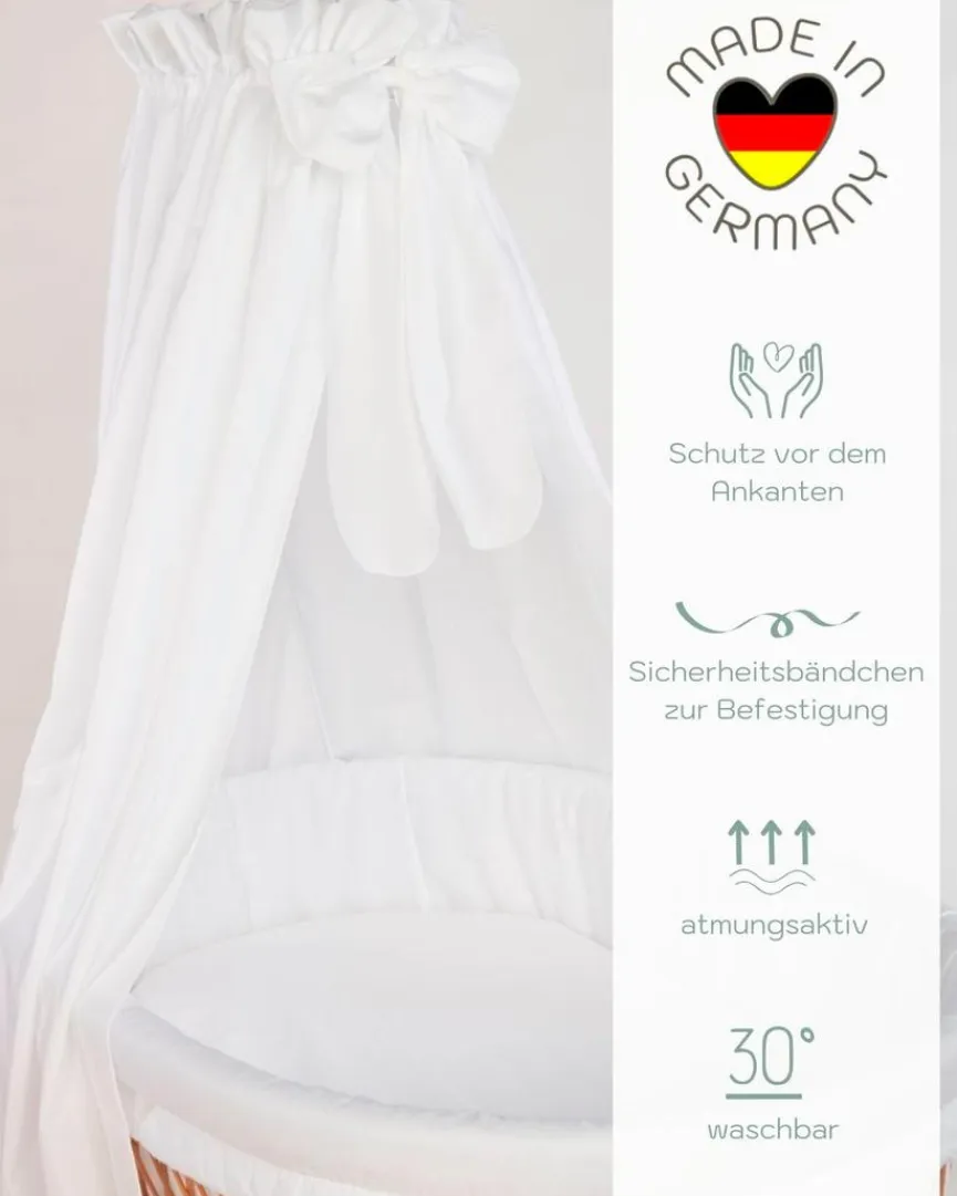 - Matratzenbezug, Spannbettlaken, Stubenwagenpolsterung und Himmel abnehmbar und waschbar bei 30° C, Matratzenbezug waschbar bei 60° C; Bezüge nicht trocknergeeignet