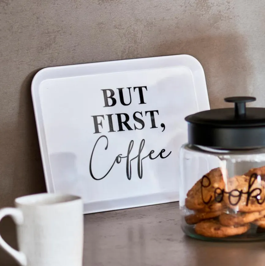 Das Tablett But First 30,5×22 cm erfreut mit einer ansprechenden Typografie und einer augenzwinkernden Botschaft, die jeder Kaffeeliebhaber nachvollziehen kann. Als praktisches Haushaltsutensil hilft das stilvolle Accessoire beispielsweise beim Servieren und Abtragen von Getränken oder Snacks. Auch als Abstellmöglichkeit auf empfindlichen Möbel-Oberflächen punktet das robuste Tablett But First 30,5×22 cm.