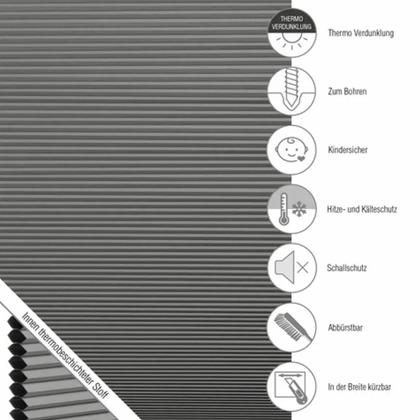 Das Thermo-Plissee Sina vereint moderne Optik mit funktionalem Nutzen. Es schützt zuverlässig vor neugierigen Blicken und reduziert evtl. eintretende Hitze. Auf diese Weise sorgt das Thermo-Plissee Sina für ein angenehmes Raumklima. Durch die feine Faltenstruktur verleiht das Rollo dem Fenster eine elegante Note und lässt sich flexibel in verschiedenste Wohnstile integrieren.