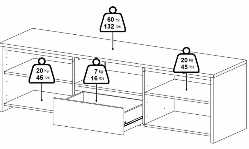 - Belastbarkeit der Deckplatte bis max. 60 kg, Belastbarkeit je Fachboden bis max. 20 kg, Belastbarkeit vom Schubkasten bis max. 7 kg