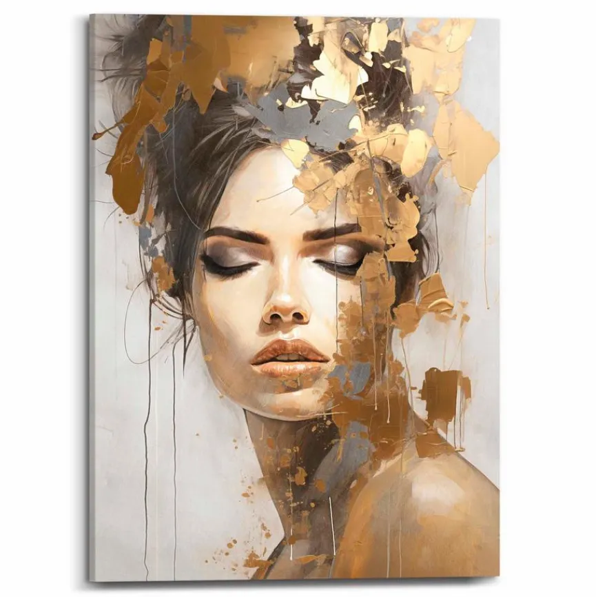 Das Wandbild 50×70 cm Chique Gold von Reinders beeindruckt mit Grazie und Chic. Kunstvoll dargestellt ist auf dem modern wirkenden Deko Bild eine wunderschöne Frau mit geschlossenen Augen und vollen Lippen. Zu zeitgemäß gestalteten Inneneinrichtungen im schlichten Stil passt das Wandbild 50×70 cm Chique Gold vorzüglich.