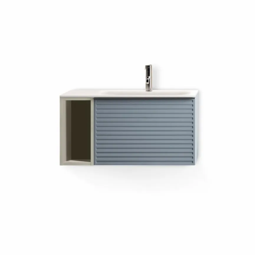 - Waschtischunterschrank mit 1 Auszug mit der Fronttype Stripes in indigo matt lackiert, mit Griffleiste in schwarz matt