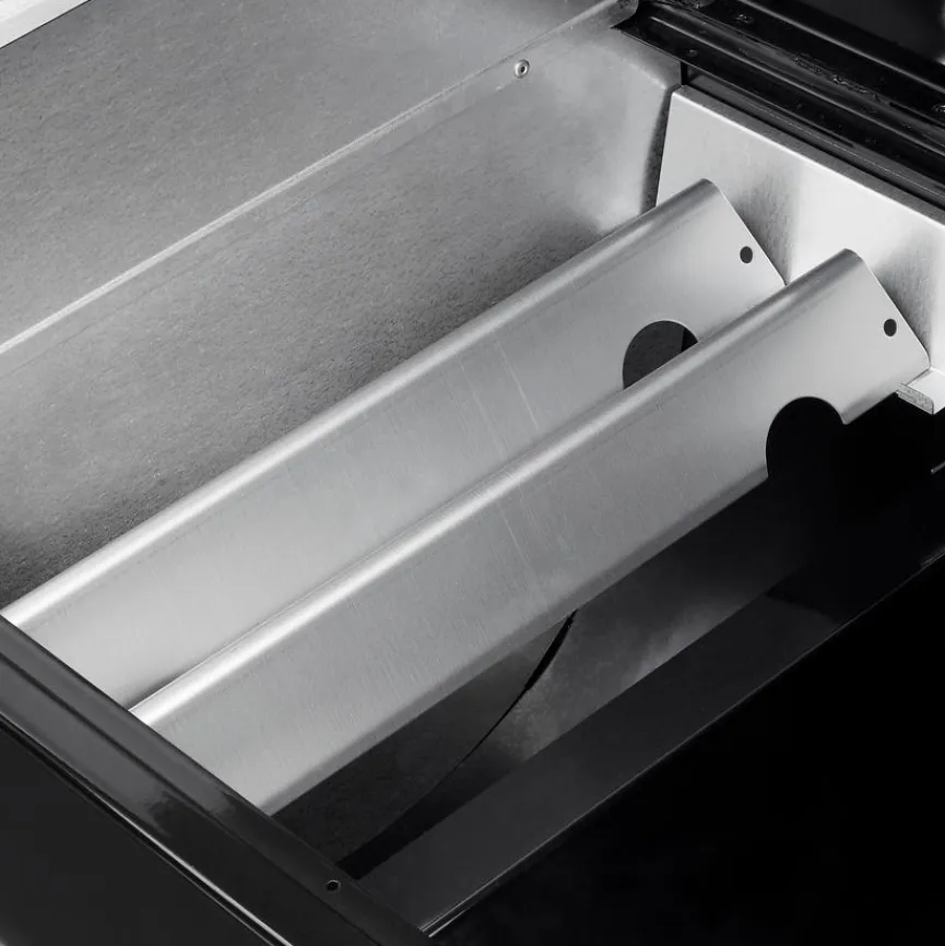 - Ein Kerntemperaturfühler enthalten, Kapazität für vier Fühler, Temperaturbereich von 95–315 °C und Asche- und Fettauffangsystem für einfache Reinigung