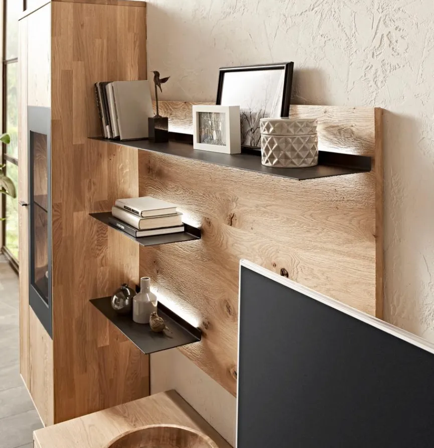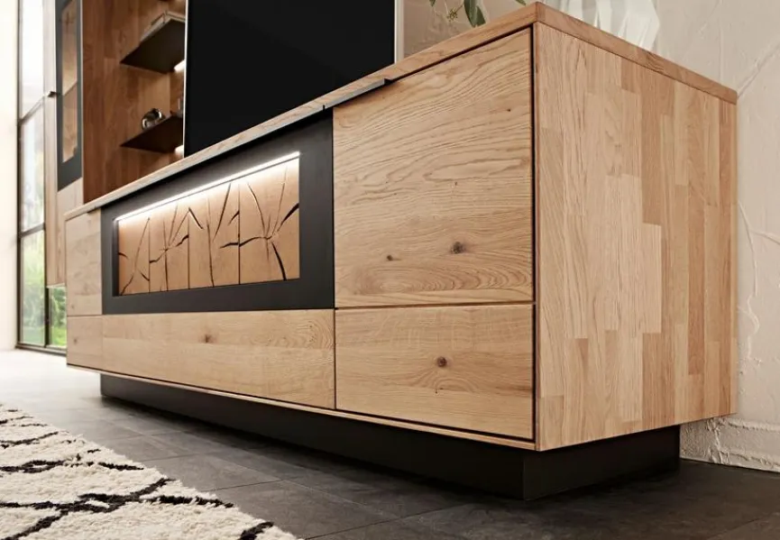 - Front und Korpus aus massiver und soft gebürsteter Wildeiche, Akzent strukturgepulvert in carbonfarbig