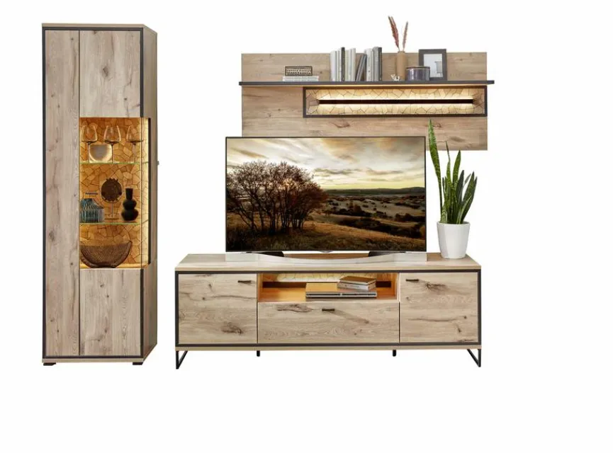 Die Wohnwand Ruben steht für naturverbundene Noten und geradlinige Eleganz. Oberflächen im rustikalen Design, klare Symmetrien und kräftige Farbkontraste gehören zu den stilprägenden Attributen dieses Sets. Ergänzen Sie die Wohnwand Ruben um eine Couch sowie um Beimöbel und Accessoires, die im zeitgemäßen Alpen-Chic gestaltet sind!
