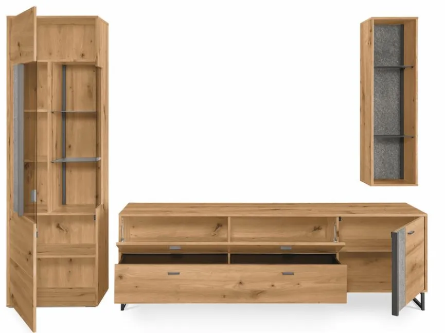 - Bestehend aus Vitrine, TV-Lowboard und Hängeregal