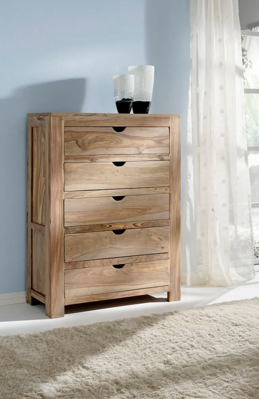 Die Kommode Yoga aus dem Hause WOLFMÖBEL imponiert durch ihr authentisches und schönes Holzdesign. Sie fügt sich in verschiedene Stile ein und verleiht dem Raum eine stilvolle Note. Mit fünf Schubladen stellt die Kommode Yoga zudem viel Stauraum zur Verfügung.