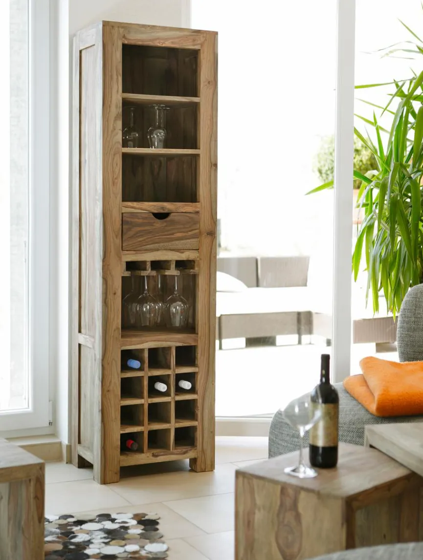 Das aus schön gemasertem, massivem Sheesham-Holz gefertigte Regal Yoga von WOLFMÖBEL wirkt sehr robust und natürlich. Daher eignet sich dieses Wandregal perfekt für alle, die bei ihrer Einrichtung Wert auf Naturverbundenheit und Authentizität legen. Dank der Halterungen für langstielige Gläser und der Fächer für Flaschen ist das Regal Yoga der Marke WOLFMÖBEL auch für Weinliebhaber eine gute Wahl.