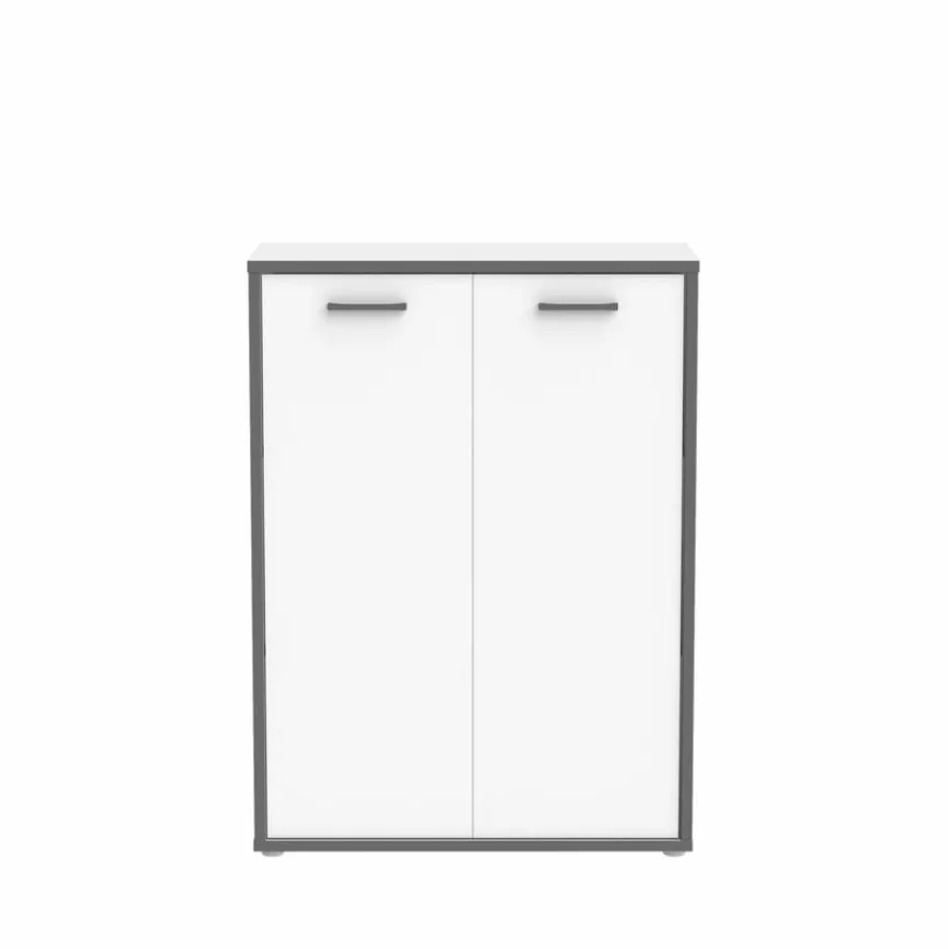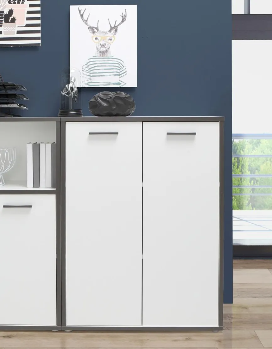 - Aus Holzwerkstoff (Spanplatte) in Weiß, Kontrastkante aus Holzwerkstoff (Spanplatte) in Uni Wolfram Grau, Rückwand aus Holzwerkstoff (HDF-Platte) in Weiß, Griffe aus Kunststoff in Grau