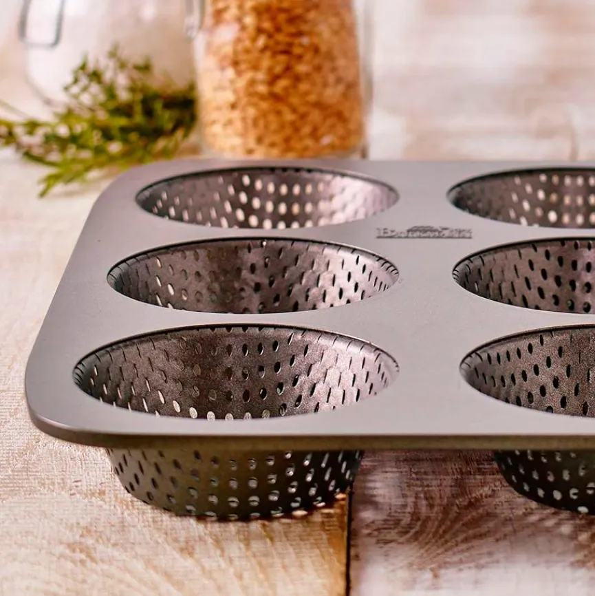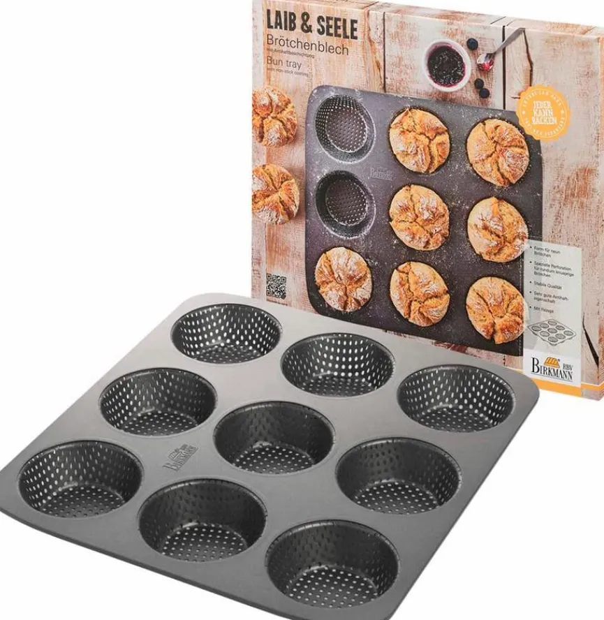 Wenn Sie sich zum Frühstück sehr gern ein Brötchen aufbacken, dann haben Sie mit dem Backblech Brötchen 9er die perfekte Lösung gefunden. In den neun Mulden hat jedes Brötchen seinen festen Platz, um in Ruhe aufzugehen. Beim Backblech Brötchen 9er klebt nichts mehr an oder pappt zusammen.
